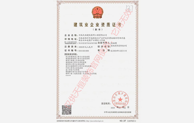 河南天恒建筑裝飾工程有限公司成立于2004年,注冊(cè)資金4000萬(wàn)元,擁有正規(guī)的建筑裝飾工程設(shè)計(jì)專項(xiàng)乙級(jí)、建筑裝修裝飾工程專業(yè)承包壹級(jí)、防水防腐保溫工程專業(yè)承包壹級(jí)、地基基礎(chǔ)工程專業(yè)承包貳級(jí)、建筑工程施工總承包貳級(jí)、鋼結(jié)構(gòu)工程專業(yè)承包貳級(jí)、城市及道路照明工程專業(yè)承包貳級(jí)、環(huán)保工程專業(yè)承包貳級(jí)等多個(gè)建筑業(yè)企業(yè)資質(zhì)。